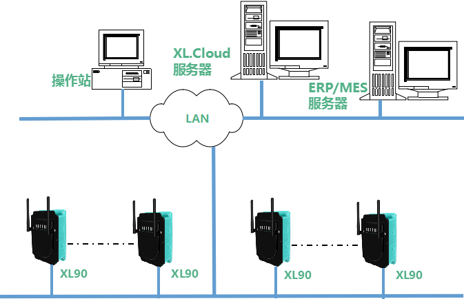 平臺系統的通信網絡,由XL90物聯網關,企業局域網,和監控服務器構成。